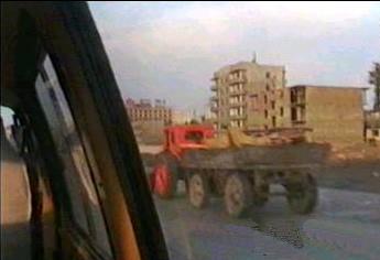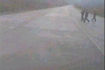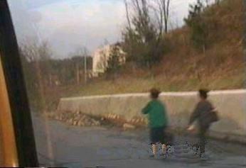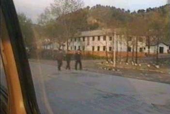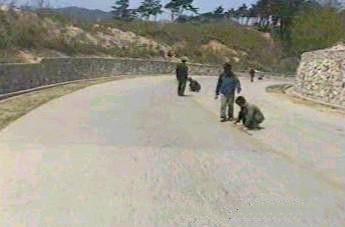 | 平壌、元山間は一応高速道路となっているが、コンクリート舗装の道幅の広い道路というべきである。片側3車線、20メートル前後の幅位に感じた。土盛りはなく、従って人間が自由に横断していた。 冬の凍結等によるコンクリート面の亀裂の補修がされておらず、自動車が100キロ近いスピードで走るせいもあり、車の天井に頭をぶっつけることしばしばであった。 写真にみられるような補修作業らしきものをやっていたが、どの程度効果があるのだろう。 |