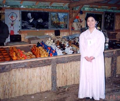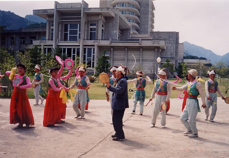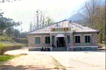 | 元山で一泊し、翌日は途中で海金剛を見学し、金剛山ホテルへ向かった。 ホテルの前方の広場では、祭りが行われていて、昼夜民族舞踊を見物することが出来た(義中先輩の故古山高麗雄氏が飛び入りで踊りに参加)。市場も開かれており、一寸覗き見をしていたら、大学で建築学科に在籍していると言う女性が、端から端までの商品を懇切丁寧に説明してくれるので、何か買わざるを得なくってしまった。 ホテルから少し離れたところに金剛山温泉と称する温泉があったが、銭湯という程度のものである。「温井里温泉」が近くにあるのでそれかと思ったがそうではなかった。 |