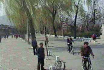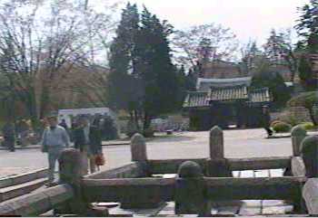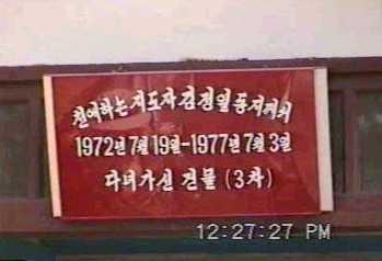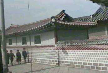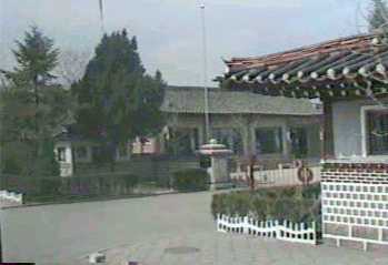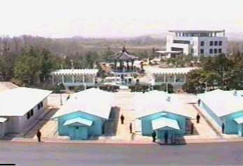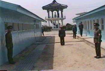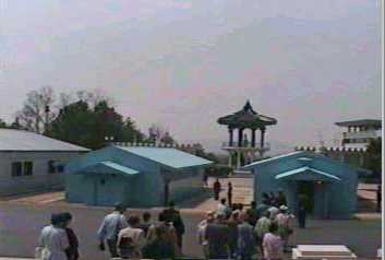 | 1995年4月24日、板門店、開城を見学。ガイド氏からは板門店の見学は当初の予定にはない特別の計らいであると恩に着せられたが、これにはそれこそ特別の事情があったのである。 旅行会社のプランでは4月20日の朝、成田空港出発、中国の上海経由で丹東に入り、4月22日に鴨緑江の鉄橋をバスで渡って新義州入り、市内を見学後、駅前の鴨緑江ホテルで宿泊、翌23日平壌へ向かうというはずであった。 ところが、鉄橋を通過して前回(1992年)の例どおり、入国審査のために右手にある税関の広場へ入ると思っていたら、バスはそのまま直進しあれよあれよと言う間もなく、新義州駅のホームまで一気に駆け上がってしまっていた。そこには数名の警察官が待ち構えていて添乗員に何かを言っている。バスから降ろされた我々への説明では新義州に入れることは出来ないからこのまま直ぐ汽車に乗って平壌へ行けということであった。 何が何やらさっぱり分からないのだが、その場の雰囲気が厳しくてとても文句を言えるような状況ではなく、皆不満ではあったがやむを得ず新義州での見学をあきらめたのである。 いってみれば一種の詐欺にあったということだったのだ。 その上、列車が発車すると、乗り込んでいた税関の係員達(警察官?)が厳重な身体および荷物検査を始め、そのやりかたたるやズボンのベルトまで緩めさせる輩(やから)もいたのである。このため一行二十数名の一団はすっかりびびってしまい、抗議を申し込むどころの話ではなくなってしまった。思うに脅かしで有無を言わさずに不平を封じ込める作戦をとったと感じたのはひがみだったろうか。 その一方で板門店見学という飴を舐めさせられたということなのである。 それはともかく午前9時ごろ、観光バスに乗って一路、板門店へと向かった。(板門店は北緯38度線の南側約5Km、開城の東約8Kmの位置にある) |