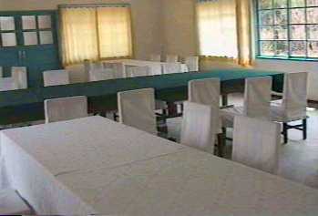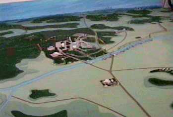 | 建物の中で立体図により係員(軍人)から説明を受け現場へ向かう。青い屋根の建物が休戦会談が行われるところ。室内のテーブルを横断しているマイクコードが境界線になっているが、この室内では自由に越境してもいいという説明であった。 |
