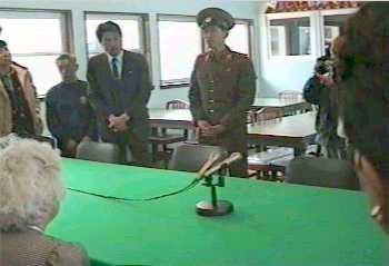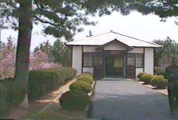 | 朝鮮戦争の休戦会談が行われた建物。その際使用されたテーブルがそのままの状態で展示されている。休戦協定書に署名する時に金日成が使用した万年筆、着用していたネクタイがガラスケースに収められていた。その他、捕獲した小銃などの武器類、宣伝の写真等が掲示されている。 |