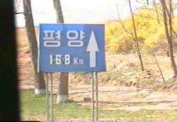 昼食をした「板門店閣」と開城へ行く途中にあった「平壌」への距離標識。 |
