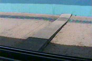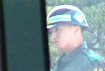 | 幅20センチ位の板状のコンクリートが境界線。窓から韓国軍の兵士の姿。この境界線を挟んで北と南の両方で警戒にあたっている。向こうにも観光客が見物する塔がある。 |
