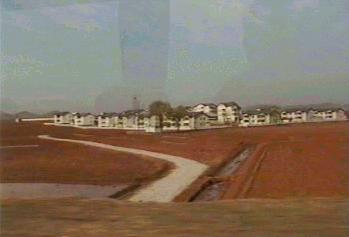 | 途中の風景。茶褐色の土の色が平壌や、あとで見学する開城の古い町並木に比べて殺風景に思えた。 |