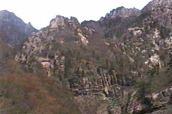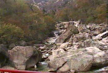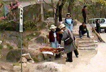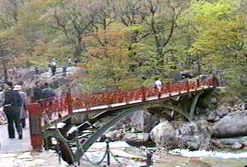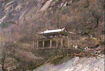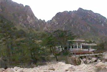 | 朝鮮総督府編纂の国語教科書に金剛山についての文章があった。「奇岩怪石」が連なる神秘の山であるというような内容であったと思う。 金剛山ホテルから「木欄館」近くの駐車場までは車で、そのあと片道約2時間程度かけて九竜淵まで行った。登山というよりは遊歩道を歩いたという感じで「奇岩怪石」の山に登ったというには程遠いものであった。 |