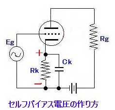3極真空管のグリッド電圧としてC電源は特別には設けず、B電源の一部を使用する。 カソードとグリッドの間にカソード抵抗Rkを挿入すると、プレート電流によってグリッドはカソードの電位よりも低い値となる。 Ckは高い方の増幅度の低下を防ぐためである。 |