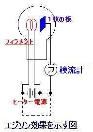 | エディソン効果 エディソン (Thomas Alva Edison 1847-1931) は1877年に蓄音機、1879年に白熱電灯を発明。 この研究の過程で彼は白熱電球の内面に黒い微粒子が付着する原因を調べ、加熱された金属物質からは熱電子が放出されるという、いわゆる「エディソン効果」を発見した。 右図のように電球の中に1枚の金属板を封入して検流計を接続し、フィラメント電源のプラス側に繋ぐと針が振れるがマイナス側では振れないという現象によってフィラメントから熱電子が放出されていることを確認出きる。 |