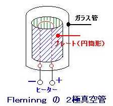 | 2極真空管 J.A.フレミング (ロンドン大学教授) 1904年 マルコーニ無線電信会社の顧問でもあったフレミングは当時無線受信に使用されていたコヒーラー検波器の不安定な動作に悩まされていたが、エディソン効果の利用を思いつき、2極管を発明した。 最初は白熱電球の中に小さな金属片を封入したものだったが、フィラメントの周囲を囲むような円筒状の形に改良し、陽極とした。 フレミング管(Fieming Valve)と称し、マルコーニ無線電信会社で生産され、無線電信の受信に使用された。 |