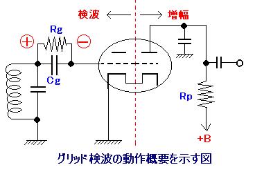 | 3極真空管のグリッドを2極管のプレートと考えれば2極真空管の動作と同じである。 検波された電圧はRgの両端に現れ、高周波成分はCgによってバイパスされて音声信号となる。したがってグリッドには検波された音声電圧と、検波によって生じた直流電圧(負電圧)が加わっている。 この直流電圧がバイアス電圧となり、グリッドの音声電圧は増幅されてプレート側に出力される。 |