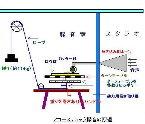 しかし他の人によって蓄音機の改良研究は引き続き行われており、音質の悪い錫に変わって蝋を用いたり、針の材料を変えたりしている(グラフォフォンと名付けられた)。 また1887年(明治20年)にはエミール・ベルリーナ(Emile Berliner)が円盤型の蓄音機を発明しグラモフォン(Gramophone)と名付けた。 寺田寅彦は円筒管式蓄音機の再生音を初めて聴いた時の様子について、随筆「蓄音機」の中で書いているが、その内容は非常に興味深い。エジソンの蓄音機が発明されてから16,7年後の中学3年生か、4年生の時であったというから明治26年か27年(1893年または94年)頃のことである。 全校生が講堂に集められているところへ文学士某が(理学士でなく文学士というところが妙であるが)蝋管式の蓄音機を持って現れた。その歴史、原理構造などを説明した後、吹き込みラッパに口を押し当てて機械を回し始め、大声で「ターカイヤーマーカーラアヽ」と歌い出した。どのようなことが展開されるかと興味津々であった中学生一同、さぞかし度肝をぬかれたことであろうと私は想像するのだが、実際クスクス笑い出した者もいたようである。 その地方の民謡か何かを歌い終わった後、文学士は汗をふきふき今度は再生用の振動膜とラッパを取り付け再び機械を回し始めた。すると妙に押しつぶされたような鼻声ではあったが、確かに先ほど文学士が吹き込んだ音がかなり忠実に再現されたので、一同感嘆しまた笑い声が起きたというのである。 寅彦は蓄音機で音楽を聴くことの出来る効用は認めているが、生で聴く音に比べてのあまりの音の悪さや雑音、そしてスクラッチ・ノイズには我慢が出来なかったようだ。この随筆が書かれたのは大正11年(1922)であるが、1924年(大正13年)には電気録音方式が発明されており音質その他大はばに改善されている(電気録音方式の周波数特性は100〜5000Hz)。このレコードを聴いたらどいう感想を述べただろうか。 エジソンのフォノグラフ第一号機では、吹込み用のラッパの前で怒鳴るような大きさの声で録音しても、再生音はやっと聞き取れる程度であったそうである。 寺田寅彦が聞いた頃にはかなり特性も良くなっていたと考えられるが、それでもトータルシステムとしての再生帯域は300〜1500Hzであったというから聴くに耐えないという感想ももっともである。 一旦蓄音機の研究を放棄したエジソンは約10年後に再び研究を始めたが、最終的にはベルリーナの円盤式蓄音機に軍配があがった。
