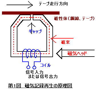 ○ 記録 狭いギャップを設けたリング状のコアにコイルを巻いた磁気ヘッドを用い、コイルに信号電流を流しながら図のように磁性体を走らせると、磁性体はギャップの幅の部分だけが漏洩磁界の影響で信号電流の強弱に応じて磁化される。 磁性体は適当な速度で走行しているので一連の連続した磁性の変化として残される。 ○ 再生の時は記録された磁性体(鋼線、テープ)を磁気ヘッドのギャップに接触させながら記録時と同じ速度で走行させる。 磁性体の表面には無数の小さな磁石がランダムな方向で並んでいる(即ち信号電流により磁化されている)と考えることが出来、その各々の磁石はNからSに向けた磁束を出しており、この磁束が磁気ヘッドのコイルと交差し電磁誘導作用により起電力を発生させる。 したがって記録時の信号に応じた信号を再現することが出来るのである。 |