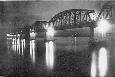 新義州側から見たと思われる鉄橋の夜景であるが、実際に見た記憶はない。