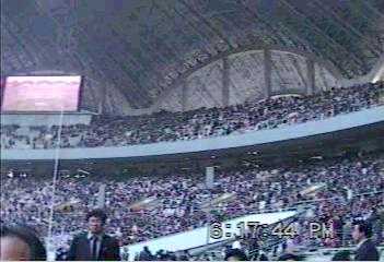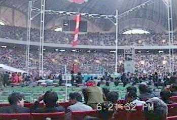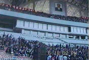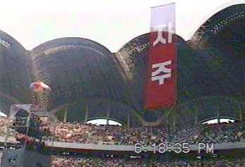 | 満員のスタジアム内と正面貴賓席前に特設されたプロレス用リンク。金日成の写真や「自主」と書いた幕。 |