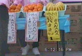 | 会場は10万人を収容出来るというメーデースタジアム。その近状に果物の売店があったが、よく見ると日本語も書かれていた。 |