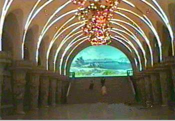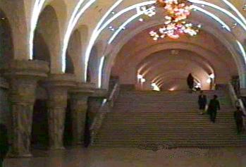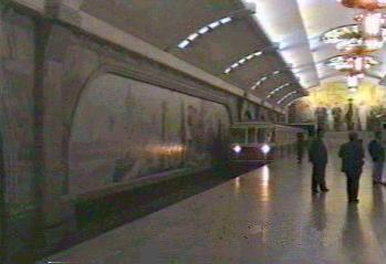 | 車両の中も暗い。 次の駅でホームに降りるとやはり天井にシャンデリアのようなものがあり、さらに階段を上がるとまたもや正面に大きな壁画が現れる。 |