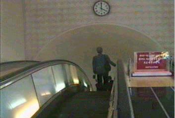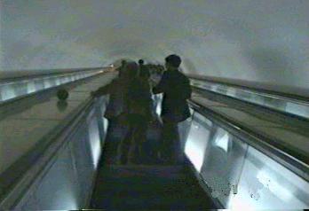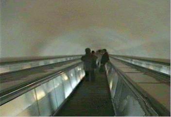 | エスカレータの両側は半透明になっていて中の蛍光灯で足元は明るいが、天井には照明器具がないから、全体としては陰気な感じがする。ホームに降り立つまで約2分15秒かかった。 |