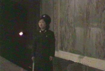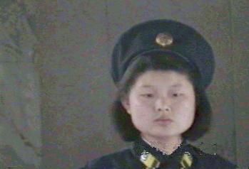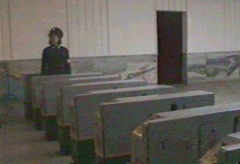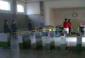 | 平壌駅の西側にある始発駅「千里馬駅」から次の「栄光」駅の1区間を乗った。改札口は硬貨を入れると扉が開くようになっている。ホームでも同じだが係員は皆女性のようである。3人立っていたうちの右側にいた女性をズームアップしてみた。年齢17、8歳にしかみえない。 改札を過ぎて地下へ向かうエスカレータに進む。約100メートル下に列車のホームがあるそうである。 |