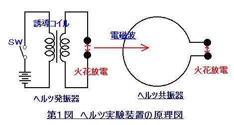 (1)1次側コイルの高電源電圧をON,OFFすると、誘導コイルの2次側の両端に接続されている二つの小導体金属球の間で、2次巻線に誘起された電流によって火花が発生する(ヘルツ発信器)。 (2)この時、図のように円形状に丸めた針金に、発信器側と同じような小導体金属球をつけたものをヘルツ発信器の近くに置くと、発振器側の火花と同じように、この小金属球間にも火花が発生する(この時、円形状の針金は電磁波に対して同調の関係になっていなければならない)。 これは発振器側の火花によって発生した電磁波が、空気中を伝播し、共振現象によって近くに置かれた針金の回路に誘導電流が発生し、同じく小金属球間に火花放電を生じるのである。 |