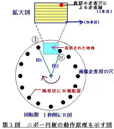 | 第2図のように光源とニポー円板との間に被写体(透明な物体の上に画像を描いたもの)を置き、ニポー円板を回転させる。円板には第1図のように円周に沿って小さな穴が渦巻状にあけられているので、円板が回転すると被写体に描かれた画像の濃淡に応じて、その穴を透過する光の強さが変化し、円板の反対側に置かれた光電管に入力される。 円板上の夫々の小穴は左から右方向に上から順番に被写体を横切って行くような形になるので(走査)、円板が1回転し終わった時には、被写体の情報が電気信号の強弱信号として出力される。 結局、円板上の小穴の数が走査線の数を表し、円板の1秒間の回転数が1秒間の送像画像数を表すことになる。 |