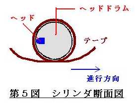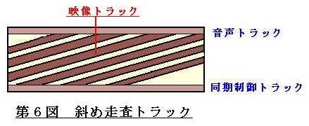 | 第4図、第5図に示すようにテープを円筒形のシリンダに鉢巻状に巻きつけた状態で走行させる。この円筒の間にヘッドを取り付けたヘッドドラムがあり、ヘッドは走行するテープに対して進行方向に沿って第6図のように斜めのトラックを記録する。 |