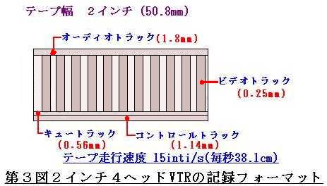 | ヘッドドラムは1分間に3600回転し、1トラックにテレビ信号の1フィールドを記録するので、4ヘッドVTRのようなヘッド間の特性の違いによる画質の劣化はない。 |