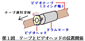 | @回転ヘッドの採用 音声の場合は15KHzの周波数帯域で十分であるが、映像の場合は4MHzの帯域を必要とする。そのためヘッドに対しての相対速度をあげなければなない。オーディオと同じようにヘッドを固定した状態ではテープの走行速度を毎秒数メートル以上にしなければならず、機械的な変動による映像の濃淡の変化、記録時間の減少、テープ走行の安定度等種々の問題が発生し、実用化することが困難であった。 この問題を一挙に解決したのがAmpex社の2インチ4ヘッド方式のVTRである。テープ速度はオーディオと同じく15インチ毎秒とし、ヘッドを高速で回転させることによってテープ対ヘッドの相対速度を飛躍的に大きくすることが出来た。 |