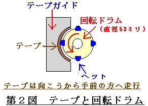| ビデオヘッドとテープとの相対的な位置関係は第1図のようになっている。 第2図に示すように、映像信号記録用のビデオヘッドがドラム(直径53mm)に90度間隔で4ヶ取り付けられており、このドラムを2インチ幅のテープに密着(真空吸引)させて毎秒240回転させるので、テープ対ヘッドの相対速度は40メートル毎秒になり、一方テープは毎秒15インチの速度で走行するので、テープ上に描かれるヘッドの軌跡(トラック)は走行方向に対してほぼ直角になる(第3図)。 |