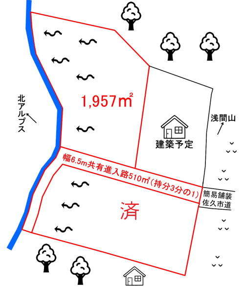 | 物件番号 | TM-228 | 概要 | 地目:山林 地勢:平坦地、傾斜地 敷地の東側が幅約4mの舗装公道に接する。 都市計画:非線引区域 無指定地域 建ぺい率:60% 容積率:100% 中部電力 公営水道 合併浄化槽 プロパン 浅間山を眺める平坦な山林。 木はほとんどが伐採済。 上水道は共有の進入路から敷地内に引込済。 |