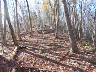 尾根に出ると意外にすっきりしていて、葉の落ちた樹木の間から周囲の山々が見え明るい。踏み跡など判別できるものは無いが、尾根すじははっきりしていて迷う心配はない。あとはひたすらかなり急な尾根すじを登りきるだけだが、落葉した尾根はやわらかく、周囲の山々を眺めながら歩けるため気持ち良い。何ヵ所か尾根すじが広くなり左右から支尾根が上ってきているが、赤いテープなどがつけられているため注意を怠らねば下山時でも迷う心配はないだろう。ポイントは周囲の景色を確認することだ。 |