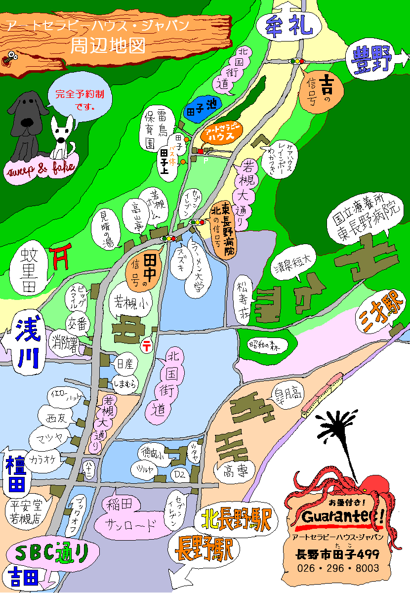 北国街道編★長野方面よりお越しの場合『田中の信号』を左折、北へ900m右折すぐです。 ★牟礼方面よりお越しの場合 『吉の信号』を右折200mで北国街道へ出ます。 そこから長野方面へ1.3km左折すぐです。 若槻大通り編★平安堂若槻店から車で北へ約10分の所です。★長野方面よりお越しの場合 『田中の信号』を真っ直ぐ北へ直進800m左折すぐです。 ★牟礼・豊野方面よりお越しの場合 『吉の信号』を真っ直ぐ長野方面へ直進1.4km右折すぐです。 ★上野・三才方面よりお越しの場合 『東長野病院北の信号』を右折、北へ直進600m左折すぐです。 ※12月下旬〜2月末頃までは 積雪のため 若槻大通りからは入って来れませんので 北国街道からお越し下さい。 長電バス編★バスでお越しの場合長野駅【善光寺口】 乗り場【D】 権堂・柳町団地 平林・中央警察署方面 三輪・吉田・吉村方面 と書かれた ところから [12]三輪・本郷駅・吉村 経由 牟礼 行 に乗って頂いてから30〜40分、 ウチのすぐ近く『田子上(たこ・かみ)』で下車。 バス停からは徒歩1分です。 詳しくは、以下の『長電バス』のサイトと、 このページ一番下の 長電バス時刻表(田子上編)をご参照下さい。 ■長電路線バス発車時刻案内トップページ ■ ■長電バス路線図 ■長電バス時刻表(田子上編) 関東方面編★ 関東方面からお越しの場合東京(上野)駅より「長野新幹線あさま」を御利用になりまして 長野駅までお越し下さい。 長野駅からは上記記載の長電バスを御利用下さい。 下り(行き)■東京→長野 上り(帰り)■長野→東京 参考(その他)■NBS交通情報 関西方面編★ 関西方面からお越しの場合名古屋駅から「特急しなの」を御利用になりまして長野駅までお越し下さい。 長野駅からは上記記載の長電バスを御利用下さい。 下り(行き)■名古屋→長野 上り(帰り)■長野→名古屋 参考(その他)■NBS交通情報 |