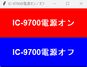 | ダウンロードした、IC-9700_power.zipを解凍すると、IC-9700_power.pywが展開されます。展開された、IC-9700_power.pywを起動すると、下記画面が表示されます。 ・「IC-9700電源オン」・・・クリックすると、IC-9700の電源がオンします。 ・「IC-9700電源オフ」・・・クリックすると、IC-9700の電源がオフします。 |