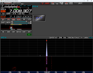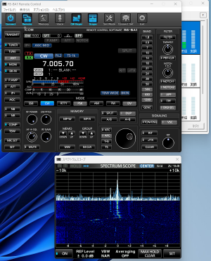 <7MHzのCW運用>RS-BA1のクライアントソフトの起動には手順があります。 1.Icom Remote Utilityを起動し、IC-7300と接続します。 2.RS-BA1 Remote Control Ver2を起動し無線機とやり取りする画面を表示します。 3.スコープは、RS-BA1 Remote Control Ver2を操作して表示します。 ※ネットワークの通信速度が遅いとまともに表示されません。 |