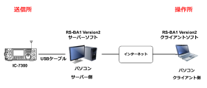 | <IC-7300+RS-BA1 Ver2のセットアップの概要> 1.IC-7300とサーバーパソコンをUSBケーブルで接続します。 2.サーバー側のパソコンを起動し、RS-BA1のサーバーソフトを起動します。 3.クライアント側のパソコンを起動し、RS-BA1のクライアントソフトを起動します。 4.クライアント側のRS-BA1のクライアントソフトでIC-7300を操作します。 5.クライアント側のパソコンには、「単一指向性のコンデサーマイク」と「リモートエンコーダーRC-28」を接続しています。RC-28は値段が少し高いですが、周波数合わせと、送信操作を簡単に行うことが出来ます。 ※RS-BA1ソフトは有料です。USBケーブルを接続するだけでリモート運用が可能です。 |