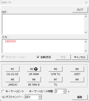 <CWの送信>Keyは、キーボードで入力します。 1.キーボードで欧文の送信は可能です。 2.599 QSLのような交信は、コールサイン、5NN、73TUなどをプリセット出来ます。 3.和文は、別途装置を用意しないと出来ません。 ※ネットワークの通信速度が遅いとまともに表示されません。 |