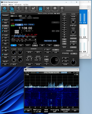 <7MHzのSSB運用>RS-BA1のクライアントソフトの起動には手順があります。 1.Icom Remote Utilityを起動し、IC-7300と接続します。 2.RS-BA1 Remote Control Ver2を起動し無線機とやり取りする画面を表示します。 3.スコープは、RS-BA1 Remote Control Ver2を操作して表示します。 ※ネットワークの通信速度が遅いとまともに表示されません。 |