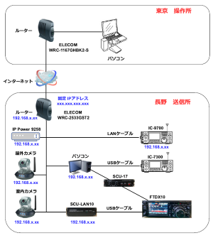 | 東京から長野にある無線機をリモート運用します。東京を操作所、長野を送信所と定義しています。インターネットがあればどこからでも運用が可能です。 |