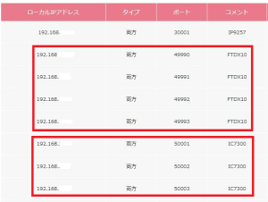 WRC-2533GST2で各無線機にポートフォワーディングする設定です。 ・FTDX10には、ポート49990〜49993を設定しています。 ・IC-7300には、ポート50001〜50003を設定しています。 |