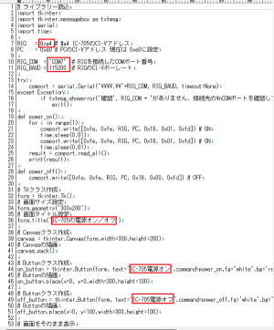 ダウンロードしたソースコードをメモ帳などで開くと編集が可能です。下記の赤い部分を各環境に合わせて編集が必要となります。 編集により、IC-7100, IC-7300, IC-9700などのアイコム無線機に対応可能です。 |