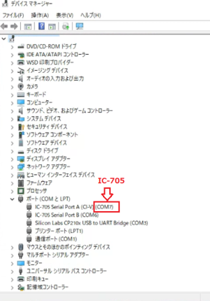 デバイスマネージャーのポート(COMとLPT)でお使いの無線機のポート番号が確認できます。このポート番号をソースコードに反映するとお使いの環境で動作可能となります。 |