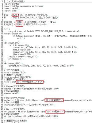 | ダウンロードしたソースコードをメモ帳などで開くと編集が可能です。下記の赤い部分を各環境に合わせて編集が必要となります。 編集により、IC-705, IC-7300, IC-9700などのアイコム無線機に対応可能です。 |