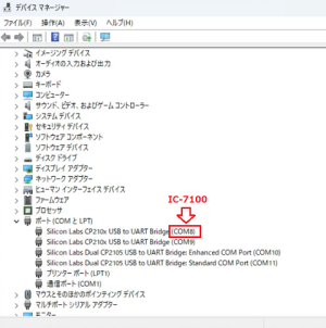 | デバイスマネージャーのポート(COMとLPT)でお使いの無線機のポート番号が確認できます。このポート番号をソースコードに反映するとお使いの環境で動作可能となります。 |