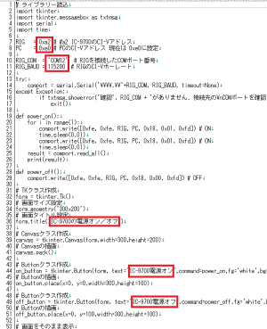 | ダウンロードしたソースコードをメモ帳などで開くと編集が可能です。下記の赤い部分を各環境に合わせて編集が必要となります。 編集により、IC-705, IC-7100, IC-9700などのアイコム無線機に対応可能です。 |