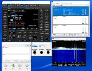 <7MHzのCW運用>RS-BA1のクライアントソフトの起動には手順があります。Keyは、キーボードで入力します。 1.Icom Remote Utilityを起動し、目的の無線機と接続します。画面右上(IC-705の例です) 2.RS-BA1 Remote Control Ver2を起動し無線機とやり取りする画面を表示します。画面左 3.スコープは、RS-BA1 Remote Control Ver2を操作して表示します。 ※ネットワークの通信速度が遅いとまともに表示されません。 |