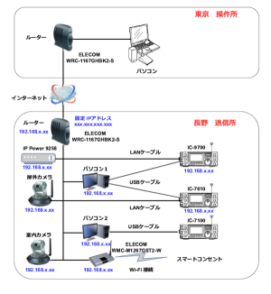 | 東京から長野にある無線機をリモート運用します。東京を操作所、長野を送信所と定義しています。インターネットがあればどこからでも運用が可能です。 |