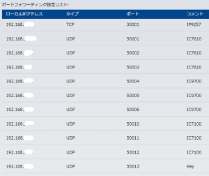 WRC-1167GHBK2-Sで各無線機にポートフォワーディングする設定です。 ・IP9258には、ポート30001を設定しています。 ・IC-7610には、ポート50001〜50003を設定しています。 ・IC-9700には、ポート50004〜50006を設定しています。 ・IC-7100には、ポート50010〜50012を設定しています。 ・CW Keyには、ポート50013を設定しています。(別装置のため予備) |