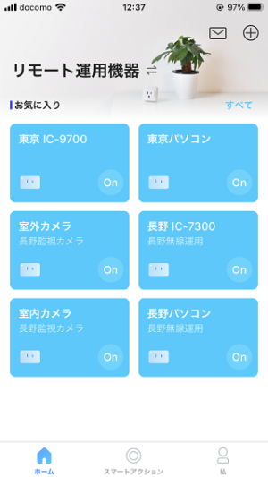 | リモート運用機器のミニスマートWiFiプラグは、通常全てONで使用します。スマートフォンで状態を確認することが出来ます。いざとなったら、該当のスマートコンセントをタップしてOFFにします。 |