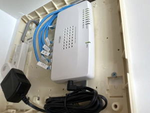 マンションのインターネット環境を調べてみるとインターネット入口と各部屋とはHUBで接続されているだけであった。今更ですが、共用部ルータが、プライベートIPアドレスを自動的に割り振っている仕組み(DHCP)のようである。 |