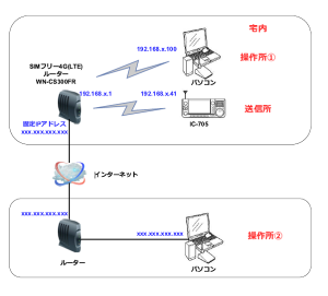 | WN-CS300FR配下のネットーワーク構成は以下のようにしました。宅内から操作する場合は、操作所@で行います。また、インターネット経由で操作する場合は、操作所Aから行います。 ・IC-705は、WiFi経由で接続します。 ・操作所のパソコンには、RS-BA1のクライアントソフトをインストールして接続します。 |
