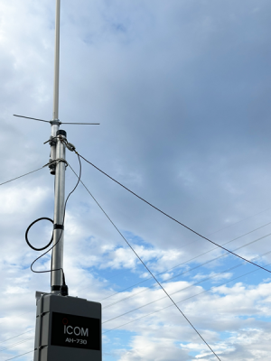 HF用のアンテナは、AH-730と約7メートルほどのケーブルです。これで3.5MHz〜50MHzにQRV出来ます。アースは、5メートルが5本のCQオームのカウンターポイズを使用しています。 VHFとUHF用のアンテナは、3バンドGP X-4000です。これで144MHz, 430MHz, 1200MHzにQRV出来ます。 |