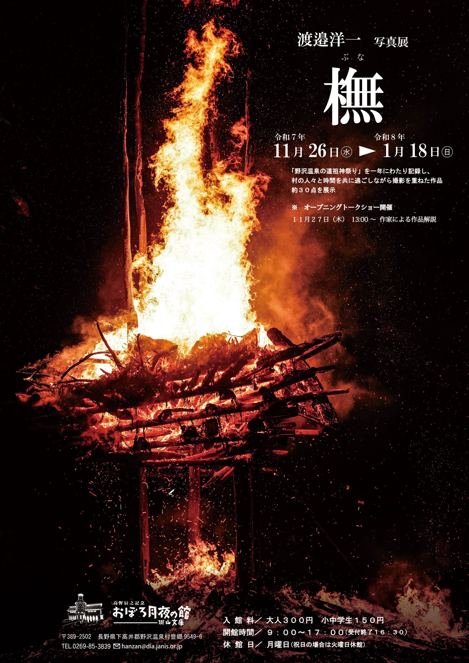 スキーが縁で野沢温泉を訪れるようになった写真家渡邉洋一氏が、道祖神祭りの主役である厄年の男たちとともに、もうひとりの主役である「橅(ぶな)」の木を見つめ、自然と人の共生、村の伝統文化を一年に渡り記録した写真約30点を展示します。